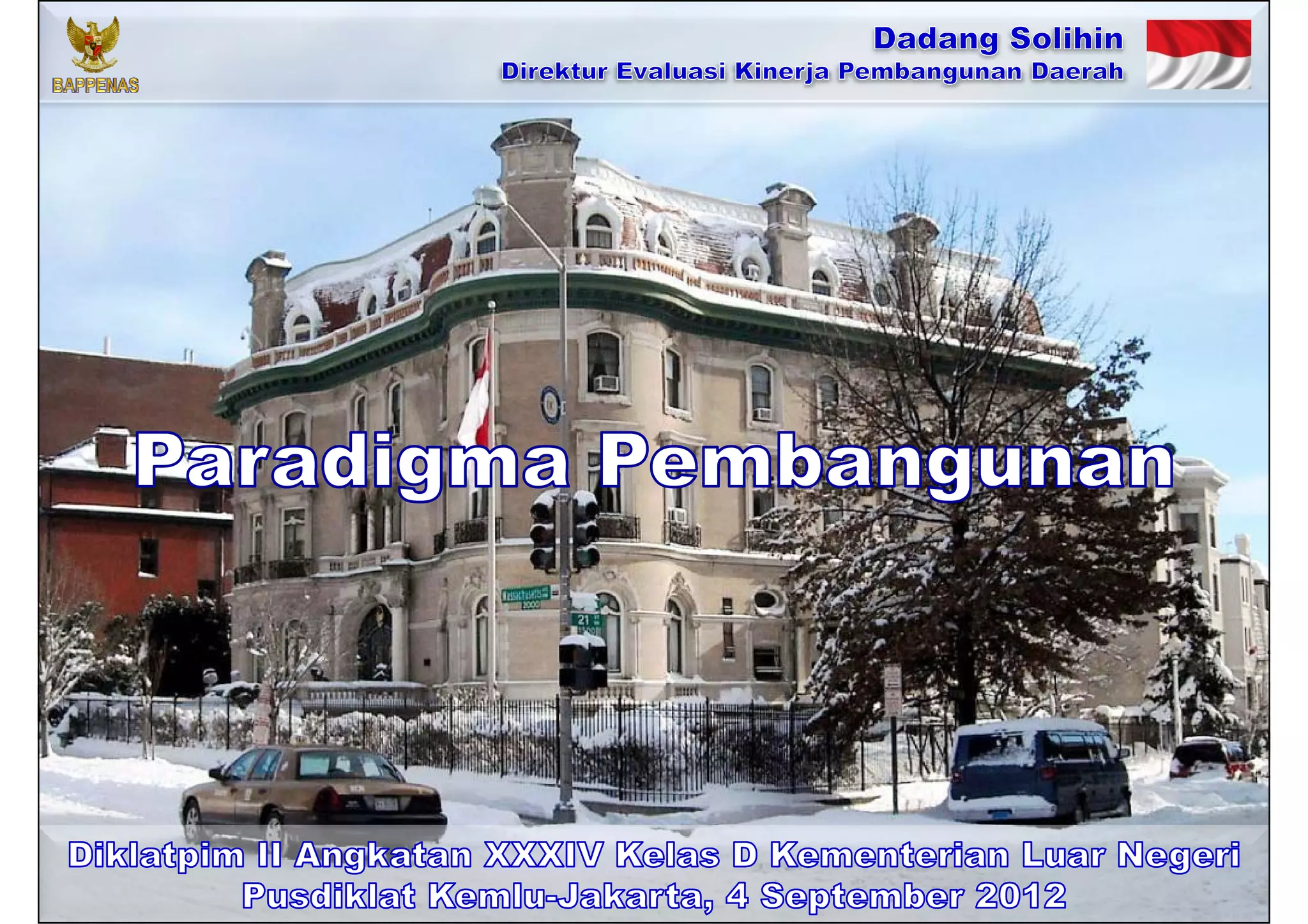 Dokumen ini membahas tentang paradigma pembangunan, peran serta interaksi antara pemerintah, dunia usaha, dan masyarakat dalam mencapai pembangunan yang berkelanjutan. Terdapat fokus pada perubahan paradigma dari pemerintah ke governance, serta pentingnya partisipasi publik dan sinergi antar stakeholder untuk mencegah praktek korupsi dan meningkatkan kualitas kehidupan. Selain itu, diuraikan berbagai tantangan dan dinamika yang dihadapi pemerintah dalam merespons perubahan ekosistem dan aspirasi masyarakat.