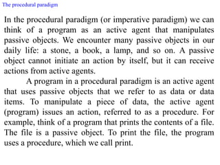 The document discusses different programming paradigms including procedural, object-oriented, functional, and declarative. The procedural paradigm uses procedures to manipulate passive data objects. The object-oriented paradigm deals with active objects that contain methods to perform actions. Functional programming treats programs as mathematical functions that map inputs to outputs. Declarative programming uses logical reasoning from facts and rules to deduce new facts in response to queries.