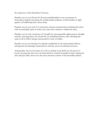 This document describes what paradise would be if certain qualities were present in a person. It states that paradise would be found in one's eyes if they showed benevolence for all mankind, in one's lips if they brought happiness to those in pain, and in one's voice if it spread the message of peace. It continues describing how paradise would be found in one's shoulders if they helped the orphaned and destitute, in one's palms if they blessed those battered by life, and in one's ears if they helped those in distress. Overall, the document suggests that paradise exists in a person who uses their qualities and abilities to alleviate suffering and make the world a better place for all people.