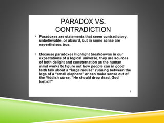 This document defines a paradox as a contradictory statement meant to be analyzed to provide insight. It provides examples of paradoxical quotes from Oscar Wilde, Shakespeare, and George Bernard Shaw. The document then gives examples of paradoxes from literature, including Animal Farm where the statement "All animals are equal, but some are more equal than others" points out a political truth, and Hamlet where Hamlet says "I must be cruel to be kind" to explain his plan to kill Claudius to avenge his father.