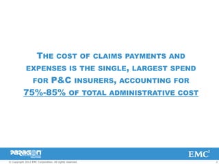 The document discusses the challenges in property and casualty (P&C) insurance claims processing, highlighting inefficiencies and high costs that can consume 75%-85% of administrative expenses. It emphasizes the importance of improving customer satisfaction, reducing operational expenses, and addressing claims leakage to enhance overall performance. Additionally, it presents a case study demonstrating how digital claims processing can lead to significant cost savings and faster claims turnaround.