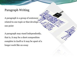 This document discusses the structure and components of a paragraph. It states that a paragraph contains a topic sentence to introduce the main idea, sentences to develop and elaborate on that idea, and a concluding sentence to wrap up the paragraph. It provides examples of different types of paragraphs, such as descriptive, persuasive, narrative, and expository paragraphs. The document serves to teach the basic elements and construction of writing effective paragraphs.