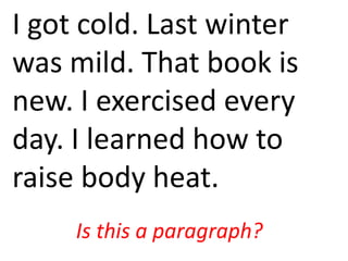 The document provides information on the basic structure and components of a paragraph, including that a paragraph contains a topic sentence that states the main idea, supporting sentences that develop and explain the topic sentence, and a concluding sentence that restates the main point. It also discusses characteristics of effective paragraphs such as being complete, unified, organized, and coherent.