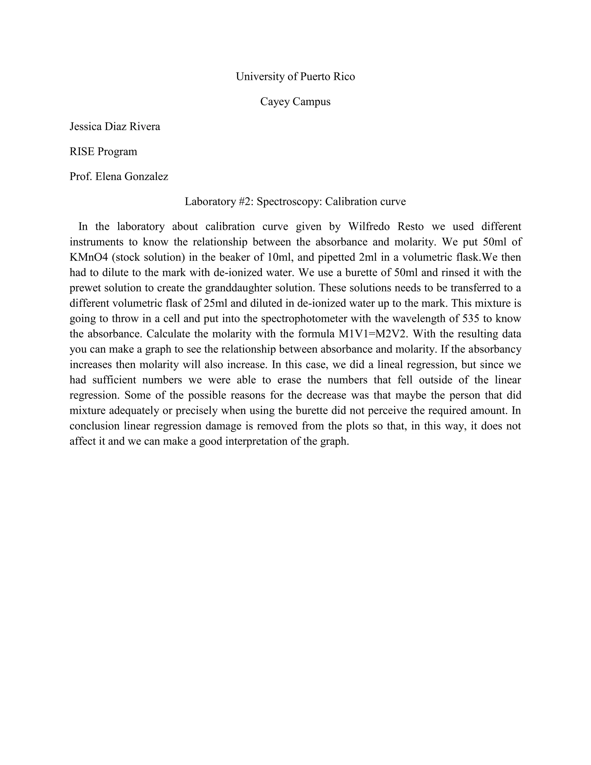 We used various instruments to create a calibration curve showing the relationship between absorbance and molarity of a potassium permanganate solution. Stock and daughter solutions were created through serial dilutions and transferred to spectrophotometer cells to measure absorbance at 535nm. The resulting data was plotted on a graph, where increasing absorbance correlated with increasing molarity. Some points fell outside the linear regression, possibly due to imprecise dilution techniques. Removing these outlier points resulted in a cleaner linear regression to better interpret the calibration curve relationship.