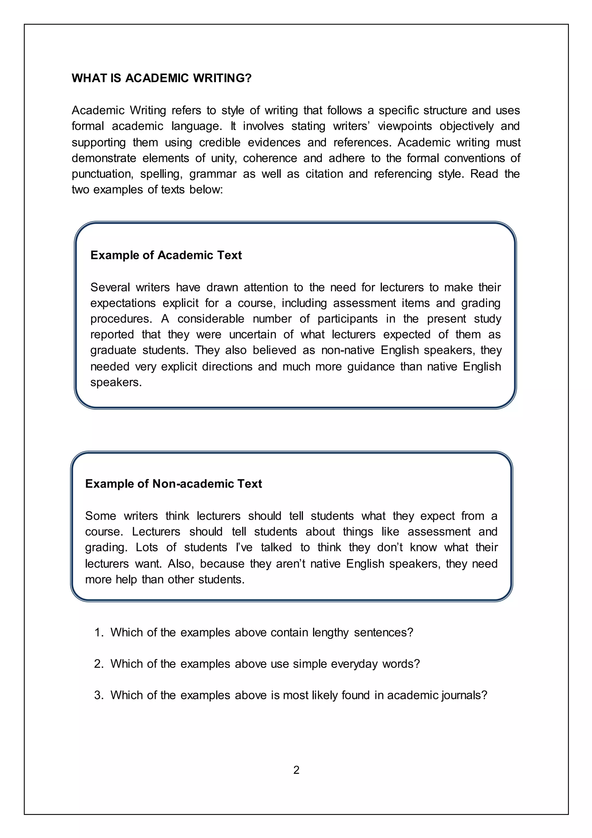 This document provides lecture notes on academic writing for a course. It begins with an introduction to academic writing and its key features and components. It explains that academic writing uses formal language and structure to objectively state and support viewpoints with evidence. The document then discusses the features of academic texts, including their organization, language, content and text types. It provides examples of academic and non-academic texts. The document also explains the components of academic essays, including the introductory paragraph, body paragraphs and concluding paragraph. It provides a sample academic text and analyzes its different parts. Finally, the document has exercises for students to practice writing thesis statements, topic sentences, and paragraphs for academic texts.