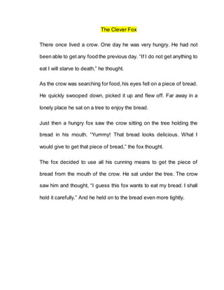 The fox sees a crow holding bread in its mouth and wants to eat it. To trick the crow, the fox sits under the tree and pretends he doesn't want the bread. The crow thinks the fox wants to steal the bread so he holds on tighter. The fox's plan works as the crow remains wary.
