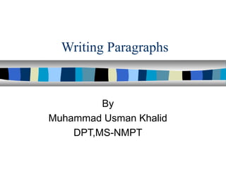 This document provides guidance on writing effective paragraphs. It discusses the components of a paragraph, including a topic sentence, supporting details, and a concluding sentence. It also distinguishes between a good paragraph example and a bad one. Additionally, it offers tips for writing strong topic sentences, such as keeping the topic sentence specific and at the beginning of the paragraph. The document encourages practicing outlining paragraphs and writing topic sentences for various topics like favorite possessions or places. Overall, the document aims to teach readers how to structure paragraphs with clear organization and a coherent main idea.