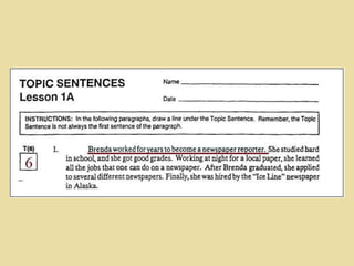 This document discusses different types of topic sentences that introduce the main idea of a paragraph, including general, clueing, and specific topic sentences. It provides examples and formulas for each type and recommends steps for writing an effective topic sentence, such as picking a sentence type and formula, exploring relevant words, and checking the sentence.