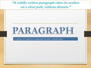The document discusses the key elements of a well-written paragraph: a topic sentence that states the main idea, supporting sentences that provide details and evidence to expand on the topic sentence, and a concluding sentence that restates the main point. It also outlines the four essential elements of a cohesive paragraph: unity, where all ideas are connected to the topic; order, how the ideas are logically organized; completeness, where all aspects of the topic are addressed; and coherence, how smoothly the reader can understand it.