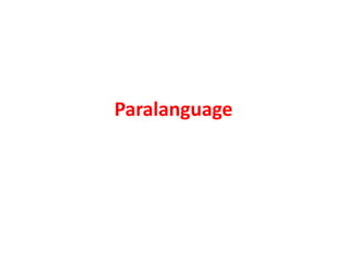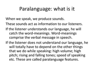 Paralanguage refers to the non-verbal elements of speech such as volume, pitch, tone, rate of speech, stress, articulation, pronunciation, and silence. These paralinguistic features convey emotions and support the verbal message. Effective use of paralanguage includes adjusting volume based on occasion, varying pitch and tone to show different meanings, stressing important words, and pausing strategically between ideas.