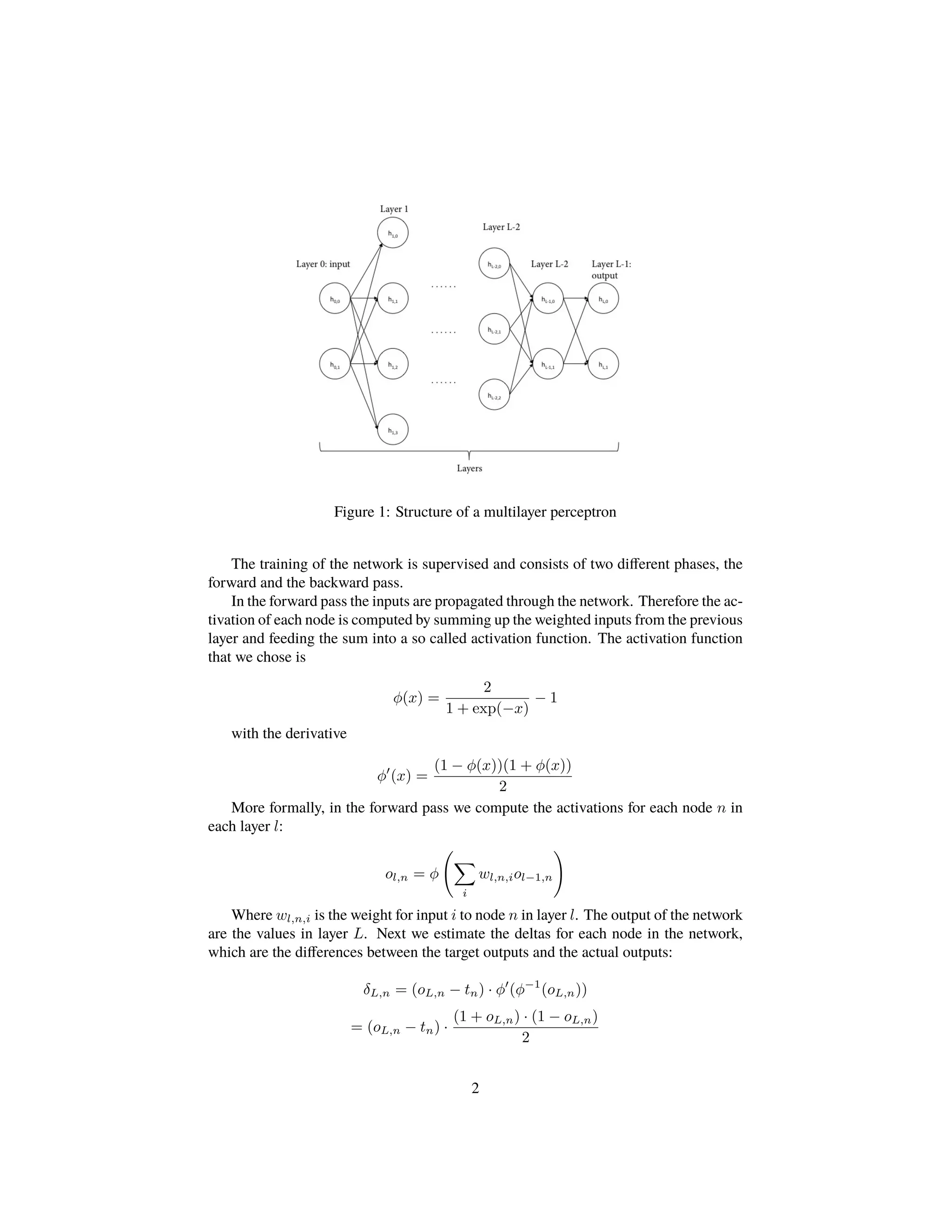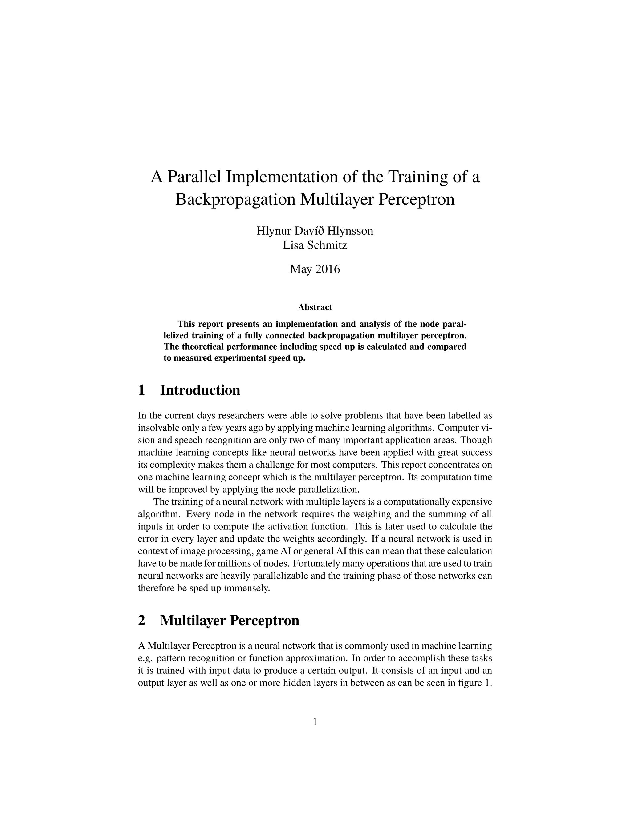 This document presents an implementation and analysis of parallelizing the training of a multilayer perceptron neural network. It describes distributing the calculations across processor nodes by assigning each processor responsibility for a fraction of nodes in each layer. Theoretical speedups of 1-16x are estimated and experimental speedups of 2-10x are observed for networks with over 60,000 nodes trained on up to 16 processors. Node parallelization provides near linear speedup for training multilayer perceptrons.