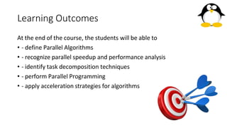 This document provides an overview of parallel and distributed computing. It begins by outlining the key learning outcomes of studying this topic, which include defining parallel algorithms, analyzing parallel performance, applying task decomposition techniques, and performing parallel programming. It then reviews the history of computing from the batch era to today's network era. The rest of the document discusses parallel computing concepts like Flynn's taxonomy, shared vs distributed memory systems, limits of parallelism based on Amdahl's law, and different types of parallelism including bit-level, instruction-level, data, and task parallelism. It concludes by covering parallel implementation in both software through parallel programming and in hardware through parallel processing.