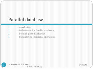 The document discusses parallel databases and their architectures. It introduces parallel databases as systems that seek to improve performance through parallelizing operations like loading data, building indexes, and evaluating queries using multiple CPUs and disks. It describes three main architectures for parallel databases: shared memory, shared disk, and shared nothing. The shared nothing architecture provides linear scale-up and speed-up but is more difficult to program. The document also discusses measuring performance improvements from parallelization through speed-up and scale-up.