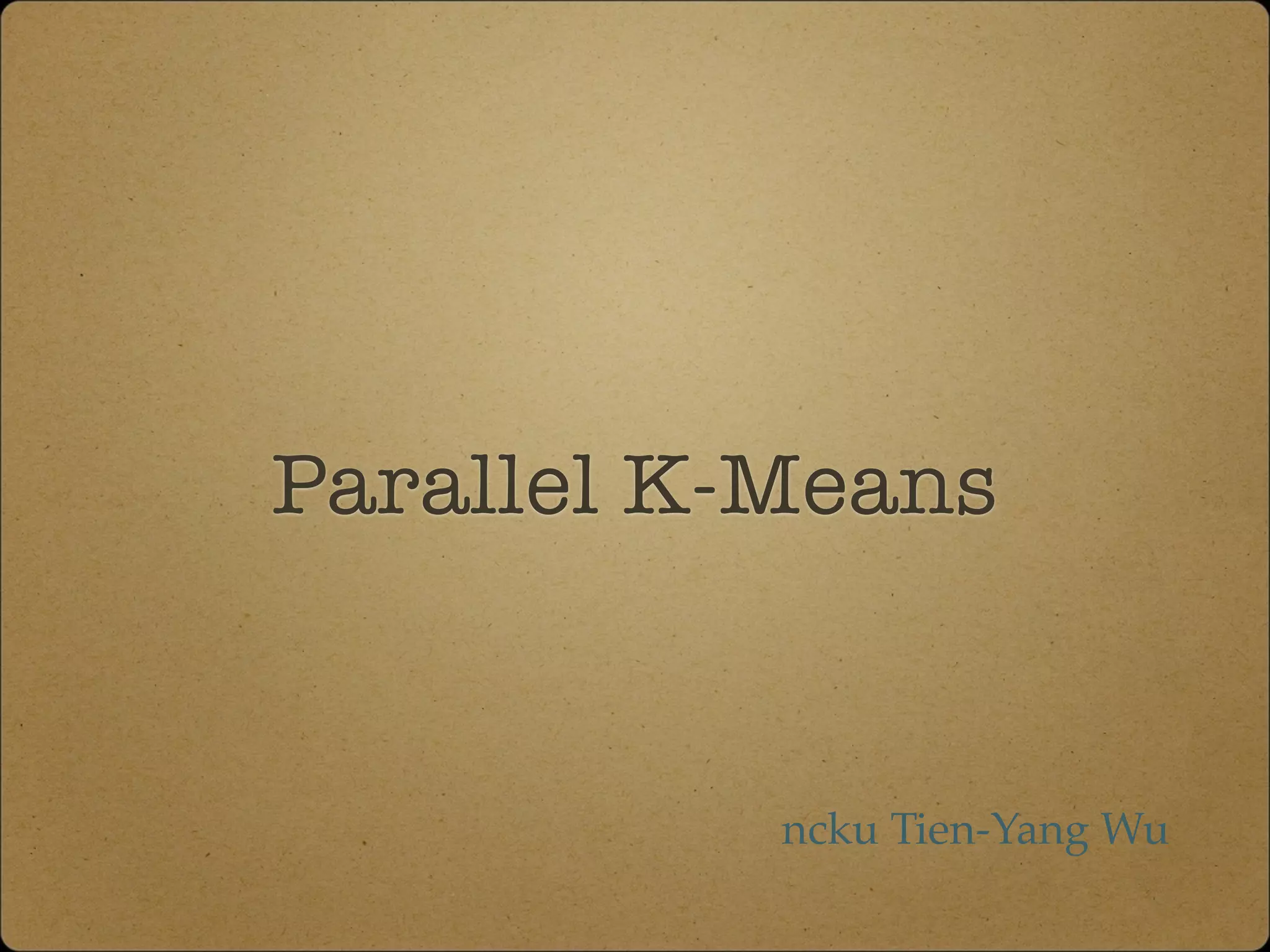 The document discusses parallel k-means clustering algorithms implemented using MapReduce and Spark. It first describes the standard k-means algorithm, which assigns data points to clusters based on distance to centroids. It then presents a MapReduce-based parallel k-means approach where the distance calculations between data points and centroids are distributed across nodes. The map tasks calculate distances and assign points to clusters, combine tasks aggregate results, and reduce tasks calculate new centroids. Experimental results show sub-linear speedup and good scaling to larger datasets. Finally, it briefly mentions k-means implementations on Spark.