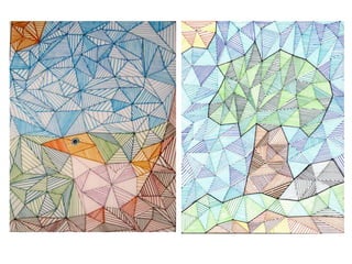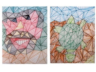 This document discusses parallel and perpendicular lines and provides instructions for drawing them. It defines parallel lines as lines that never intersect and are always the same distance apart. Perpendicular lines intersect at right angles. The document describes 45 and 60 degree set square rulers used to draw parallel and perpendicular lines and provides examples of artists who have used these techniques, including Piet Mondrian, Eusebio Sempere, and Victor Vasarely. Steps are outlined to have students connect dots on paper with rulers to make triangles and then draw parallel lines along the triangles using set square rulers and color pens.
