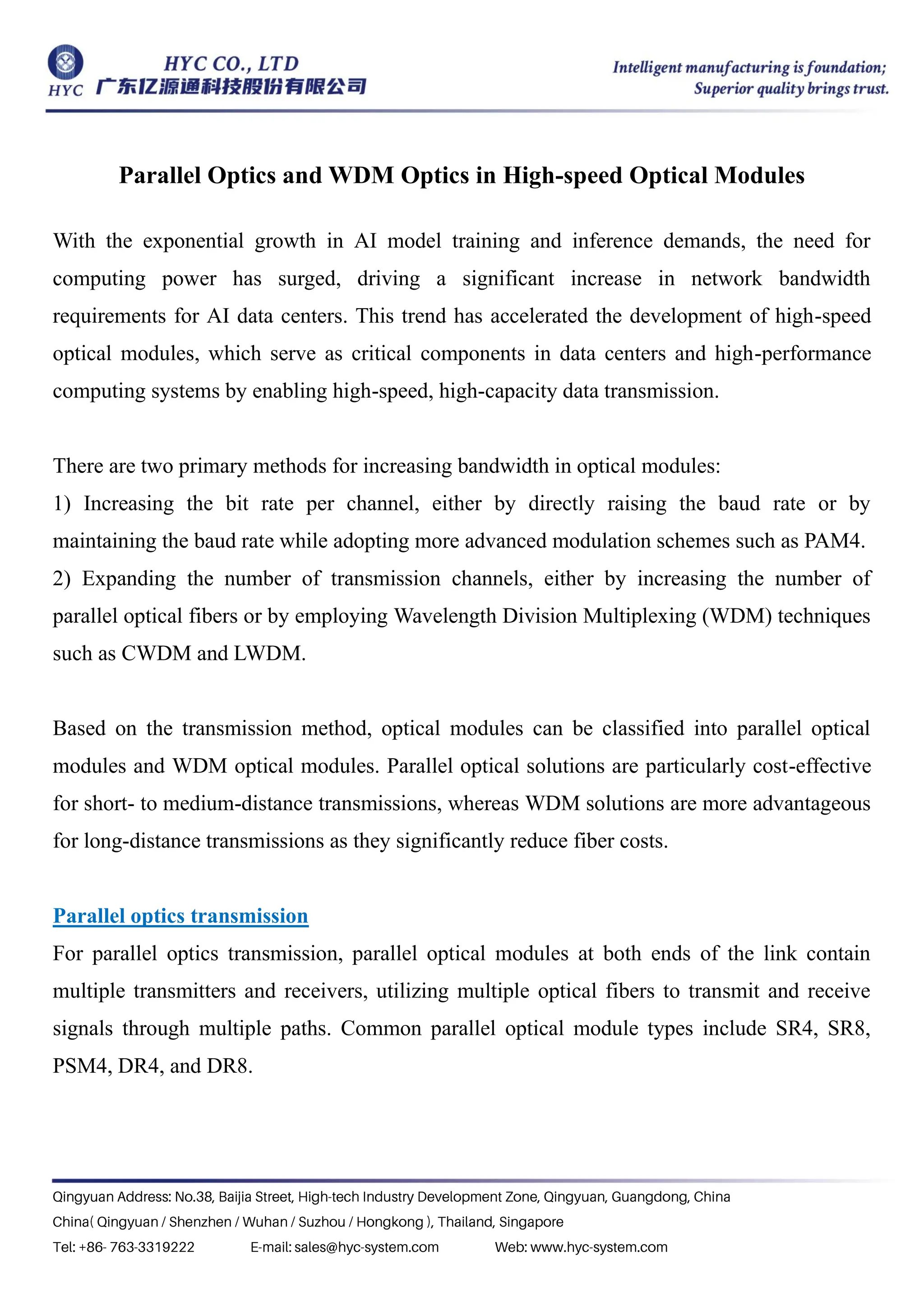 The document discusses the increasing demand for high-speed optical modules driven by the growth in AI workloads and the need for greater network bandwidth in data centers. It outlines two main methods for enhancing bandwidth: increasing bit rates per channel and expanding the number of transmission channels using parallel optics and wavelength division multiplexing (WDM) techniques. Additionally, it highlights the importance of integrating optical components and advanced technologies to improve transmission efficiency and reduce costs.