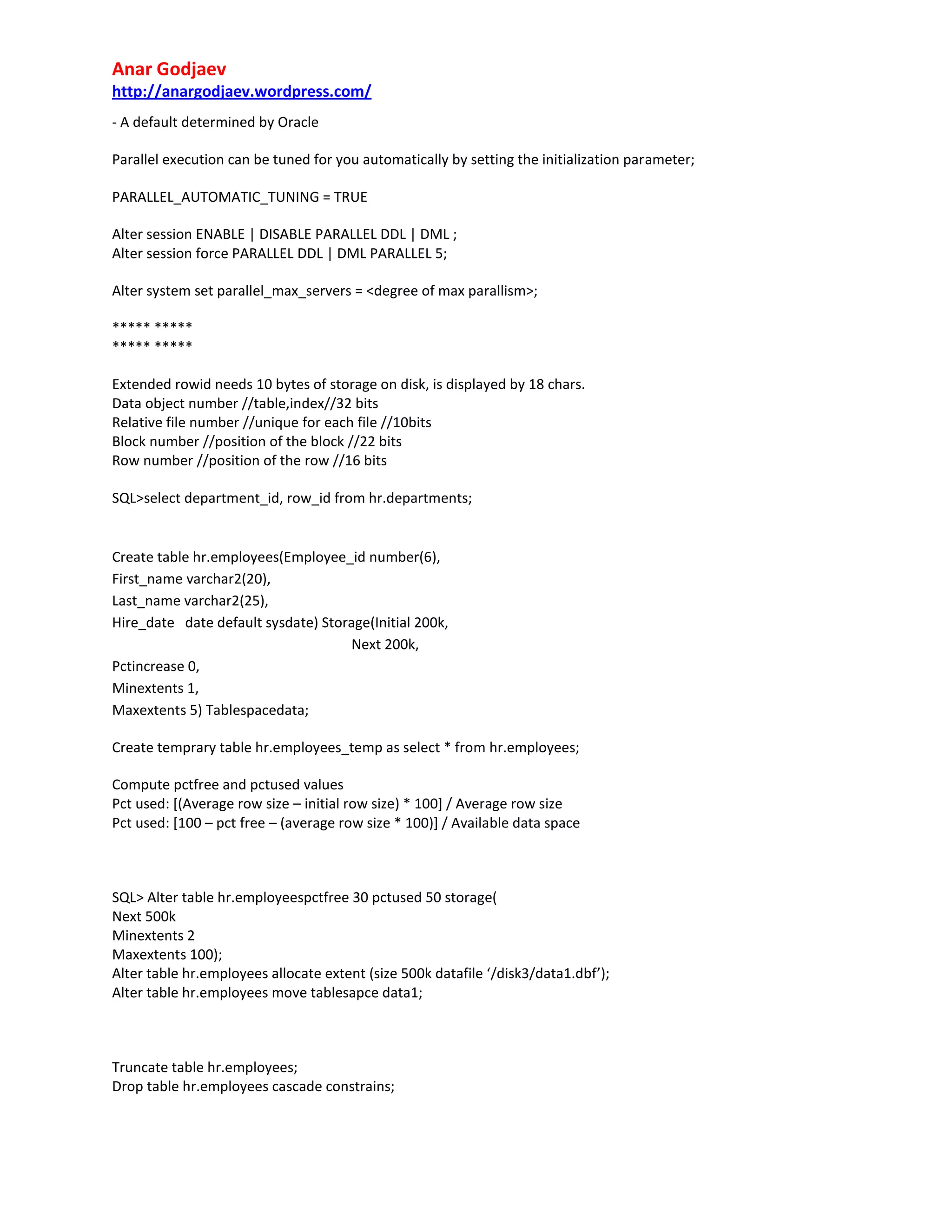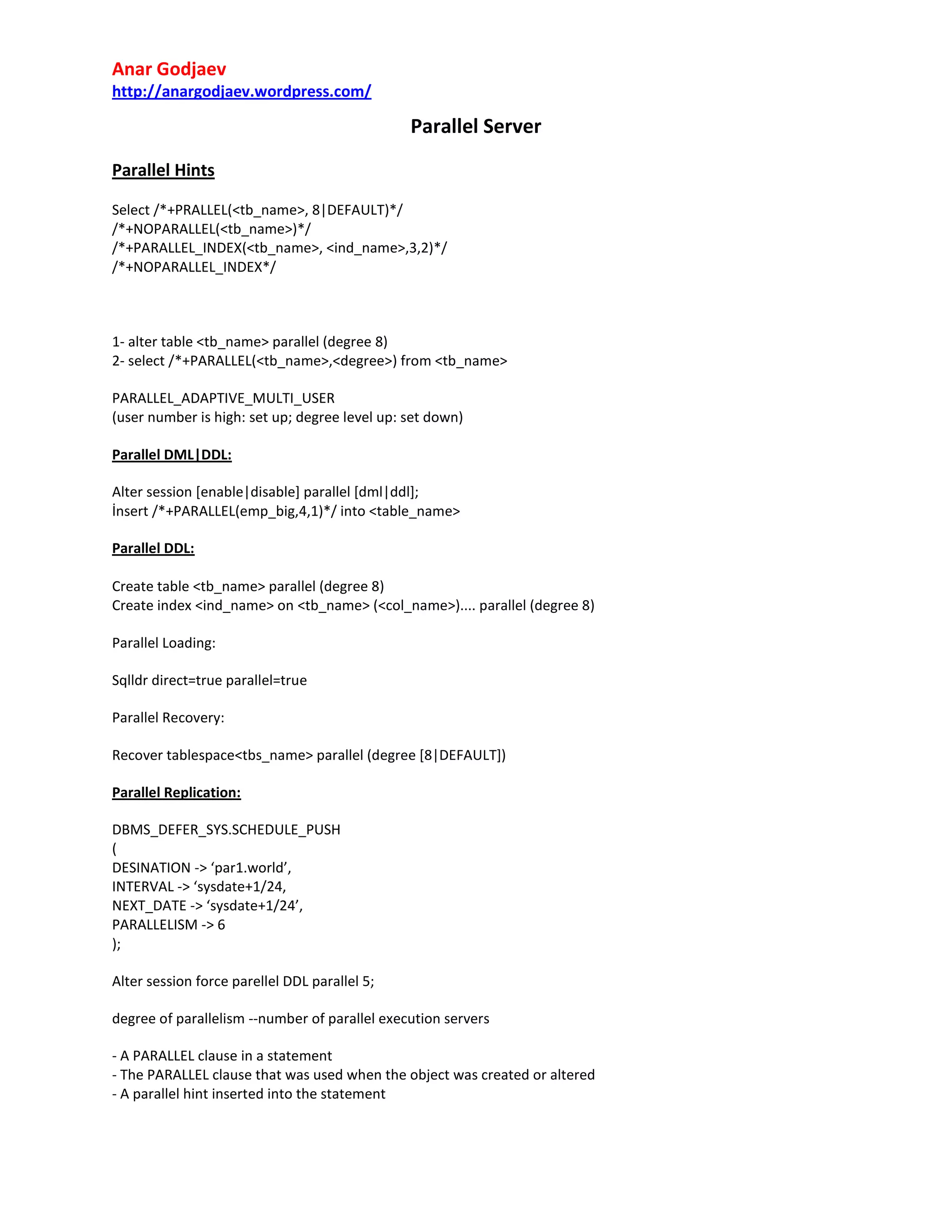 This document discusses parallel processing in Oracle databases. It provides hints and commands for enabling and controlling parallel execution for SQL statements, DML, DDL and other operations like loading, recovery and replication. It also covers concepts like the structure of Oracle rowids and storage parameters for tables.