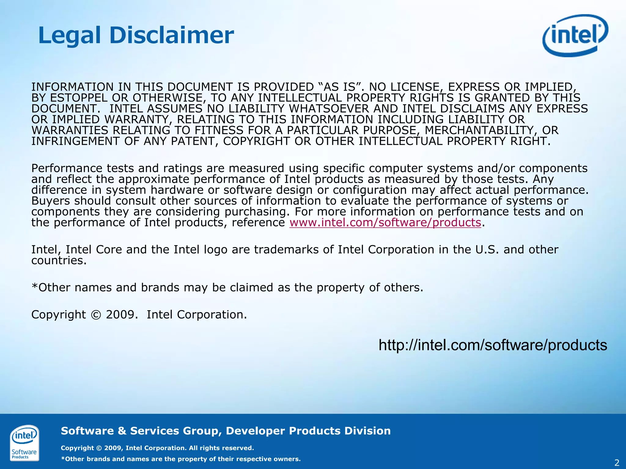クに直接対処する • スレッドとベクトル化による協調した並列化:一つの記述により、複数のメカ ニズムを対象にできる • モジュール化にともなうオーバーヘッドをなくす:自動的に複数のオペレー ションを融合させる • 幅広く、なおかつ深く:開発者は抽象化のレベルを選ぶことができ、必要が あれば詳細にまで掘り下げることができる Software & Services Group, Developer Products Division Copyright © 2009, Intel Corporation. All rights reserved. *Other brands and names are the property of their respective owners. 30