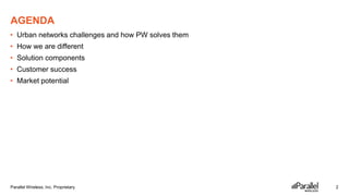 Parallel Wireless presented their All G urban macro Open RAN solution. Their solution is cloud-native, O-RAN compliant software that supports 2G, 3G, 4G and 5G networks on a single platform. It addresses challenges for urban networks like high deployment costs, OPEX costs, and the need to support new technologies and services. Parallel Wireless claims their solution reduces costs, provides flexibility, and ensures networks are future proofed for technologies like 5G. They highlight key customer deployments and the potential market opportunity for their All G urban macro Open RAN.