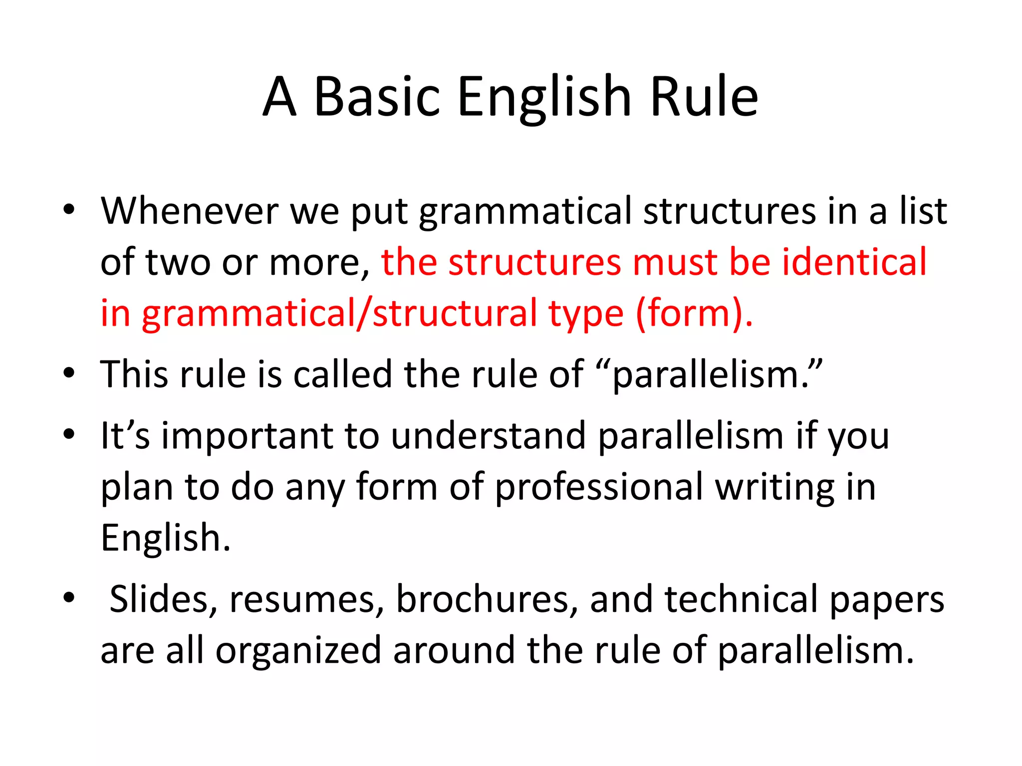 The document discusses the importance of parallelism in professional writing. It provides examples of how to construct parallel lists using different grammatical structures, such as noun phrases, verb phrases, adjective phrases, and clauses. Mistakes in parallelism are analyzed, such as mixing different types of structures within a list or not using consistent levels of detail. The key is to use identical grammatical forms for all items in a list.