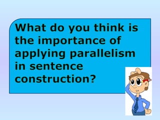 The document contains a series of short passages and questions about grammar concepts like parallel structure. Some examples of non-parallel constructions are provided, along with their parallel revisions. The key concept of parallelism - where elements in a series should be grammatically similar - is tested through examples requiring revision to make the elements parallel.