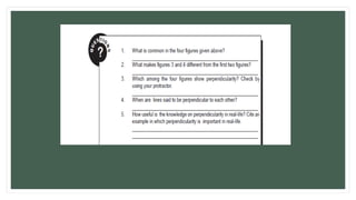 This document contains a math lesson on parallelism and perpendicularity. It includes an opening prayer, activities to identify parallel and perpendicular lines using optical illusions and geometry examples, and a worksheet for students to identify different types of angles and lines related to parallelism and perpendicularity. The goal is to help students understand how to establish whether two lines are parallel or perpendicular.