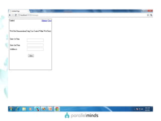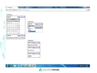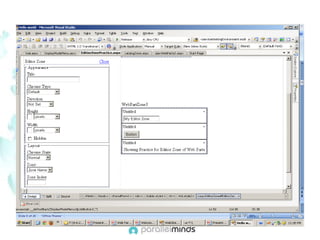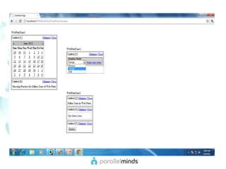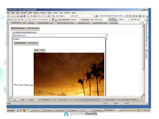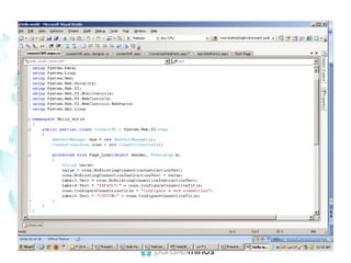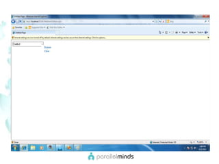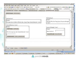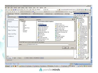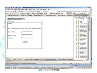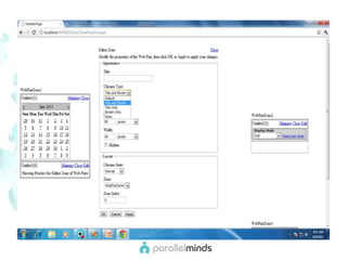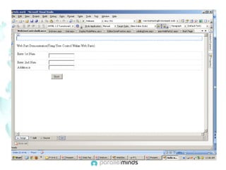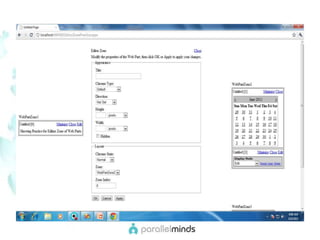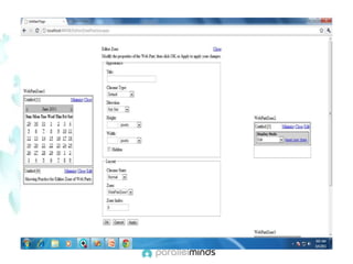 This document provides an overview and introduction to web parts in ASP.NET. It discusses what web parts are, the benefits they provide, and how they work. Key points covered include how web parts allow for personalization, reuse of content across pages, and communication between parts. The document also outlines the basic infrastructure that supports web parts, including the WebPartManager, zones, and how to create simple web parts and use controls within them.