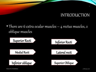 Paralytic strabismus is caused by motor deficiency of one or more extraocular muscles due to neurogenic, myogenic or junctional disorders. Common types include third, fourth and sixth nerve palsies which result in limited eye movements and misalignment. Third nerve palsy affects elevation, adduction and depression while fourth and sixth nerve palsies impact specific individual muscles. Investigation involves assessment of eye alignment, movements, diplopia and visual acuity to localize the lesion. Management depends on severity but may include occlusion therapy, prisms or strabismus surgery.