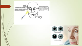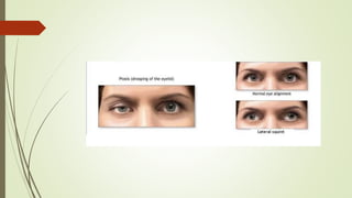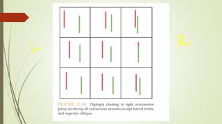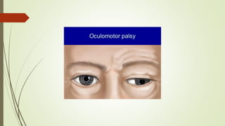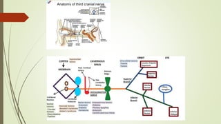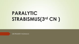 This document provides information about paralytic strabismus caused by a third cranial nerve palsy. It discusses the anatomy and supply of the oculomotor nerve. Signs of a third nerve palsy include ptosis, divergent squint with intorsion, restricted eye movements, and diplopia. Causes can include lesions of the nerve nuclei, nerve trunk, or intraorbital muscles. Investigation involves assessing eye alignment and movements to localize the site of lesion, with diplopia charting helping to differentiate nerve or muscle involvement.