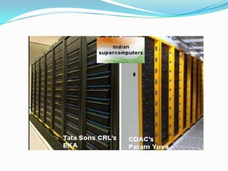 Param Yuva II is India's fastest supercomputer unveiled in 2013. It has a peak performance of 524 teraflops and uses a hybrid system of high performance computers. Param Yuva II has a storage capacity of 200 TB and supports parallel computing through required software. It is more energy efficient than previous supercomputers, consuming 35% less power. The supercomputer will be useful for research in various fields like space, bioinformatics, weather forecasting, and more.