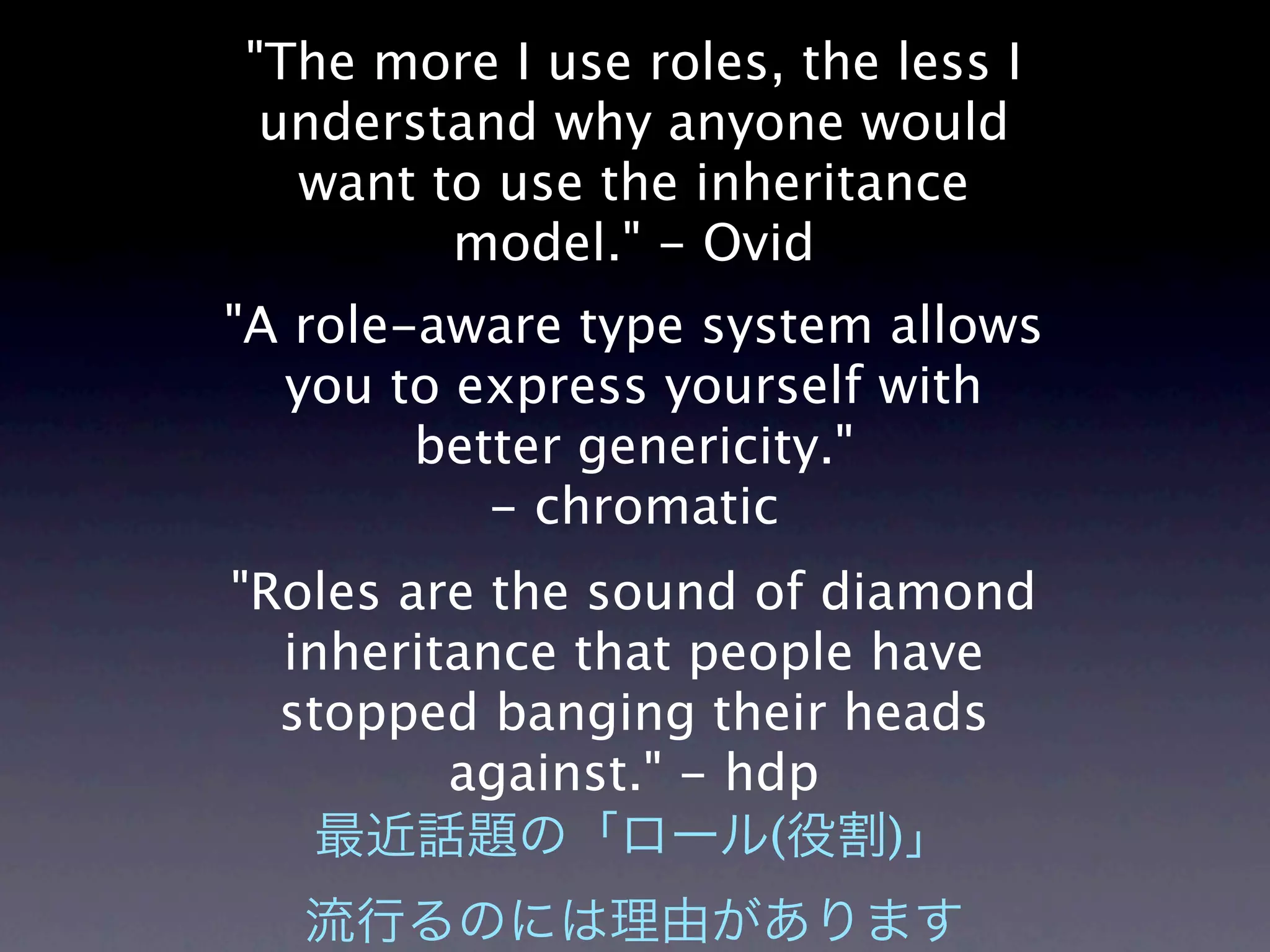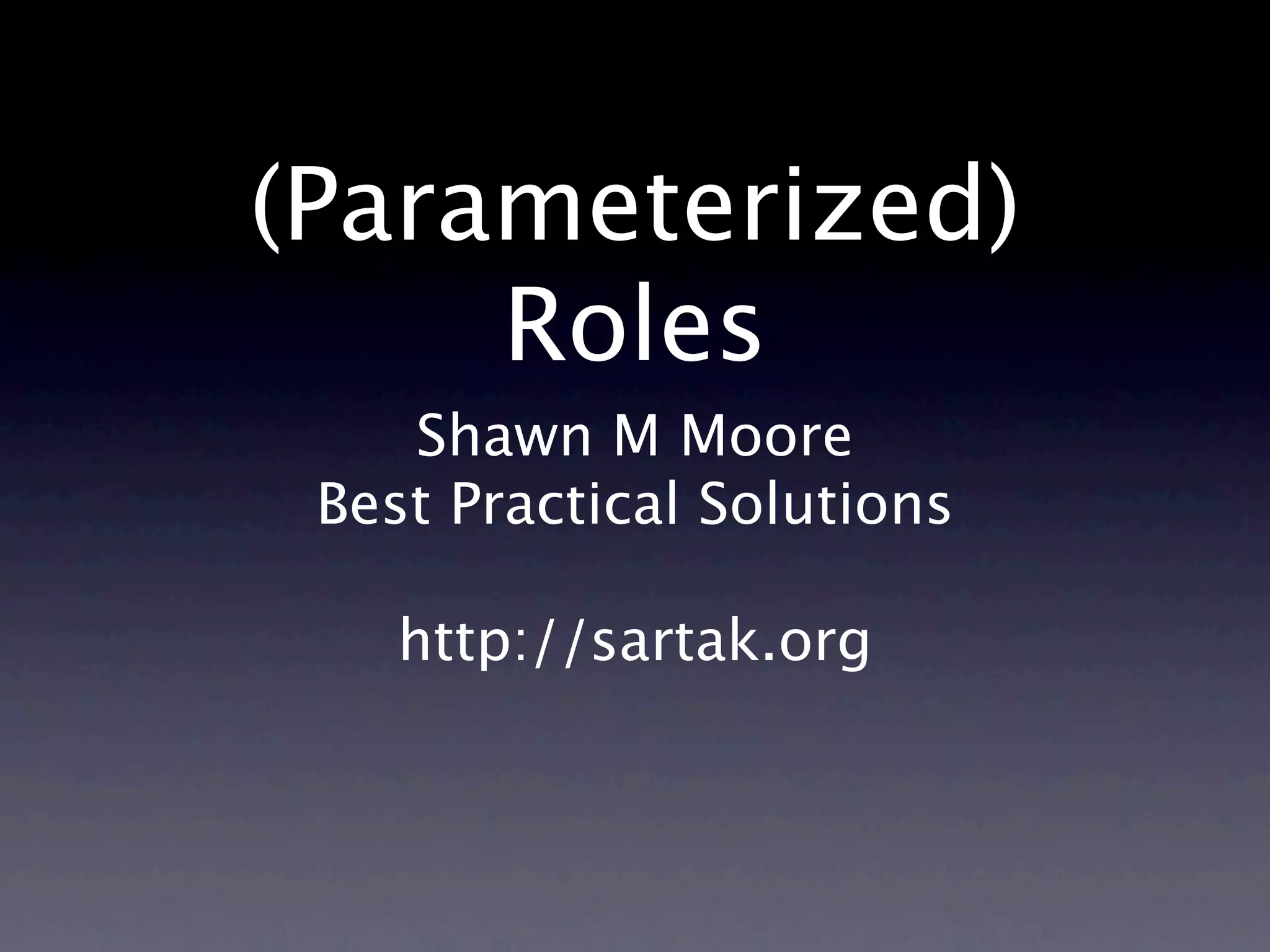 The document discusses the concept of roles in object-oriented programming, particularly in Moose, a Perl module, highlighting the advantages of roles over traditional inheritance. It provides various code examples showcasing role implementation, conflict resolution, and the use of parameterized roles to enhance genericity. Additionally, it references other related concepts and the benefits of a role-aware type system.