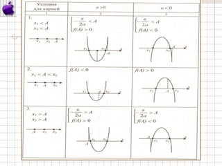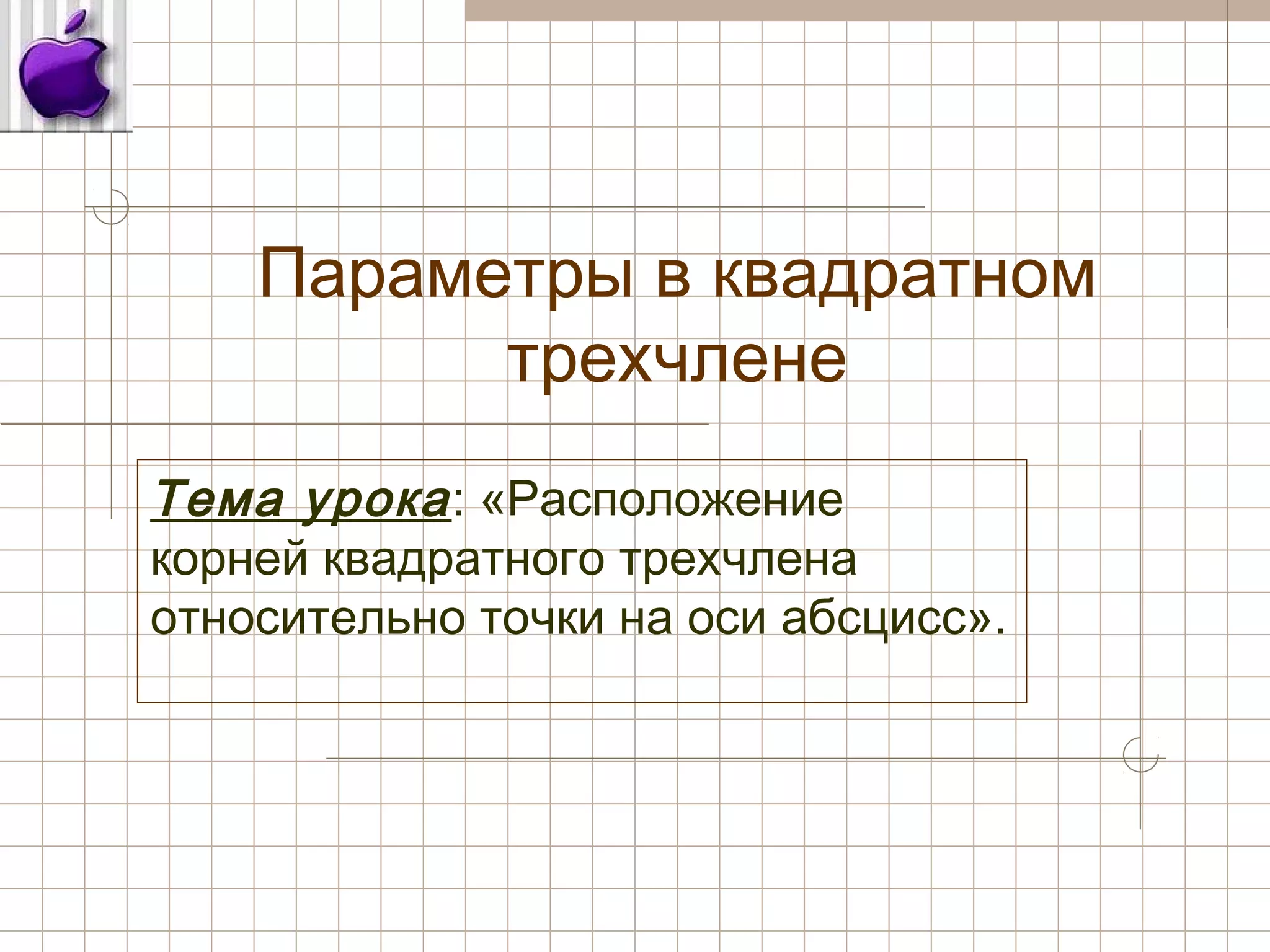 Документ посвящен теме расположения корней квадратного трехчлена относительно точки на оси абсцисс и геометрической интерпретации условий на параметры. Рассматривается, при каких значениях параметра а корни уравнения располагаются по определенным сторонам относительно заданной точки. Приводятся задачи с конкретными условиями и решениями, касающиеся расположения корней квадратного трехчлена.