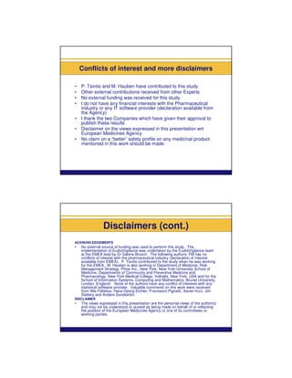 This document summarizes a presentation on parametric modelling of time to onset of adverse drug reactions using parametric survival distributions. It discusses using hazard functions from parametric distributions to analyze reported time to onset data from EudraVigilance to detect safety signals. Two examples are analyzed: liver injuries with bosentan and infections with TNF-alpha inhibitors. The results show patterns consistent with the known safety profiles and mechanisms of the drugs. Future work could improve understanding of reporting mechanisms and test the approach on more data.