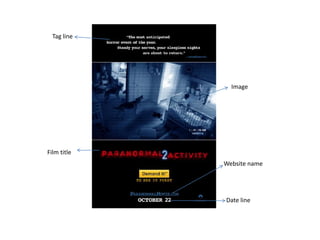 This poster analysis discusses the color scheme, image, tagline, film title, website name, and date line of the movie poster for Paranormal Activity 2. The color scheme is dark with blacks, whites, blues, reds, and yellows to create a gloomy, tense atmosphere. The image shows a baby and dog staring towards a door at night, building anticipation. The exaggerated tagline promises viewers the most terrifying horror experience of the year and sleepless nights. The broken camera effect on the film title matches the surveillance theme. Placement of elements like the website, date, and font sizes are designed for maximum visibility and clarity.