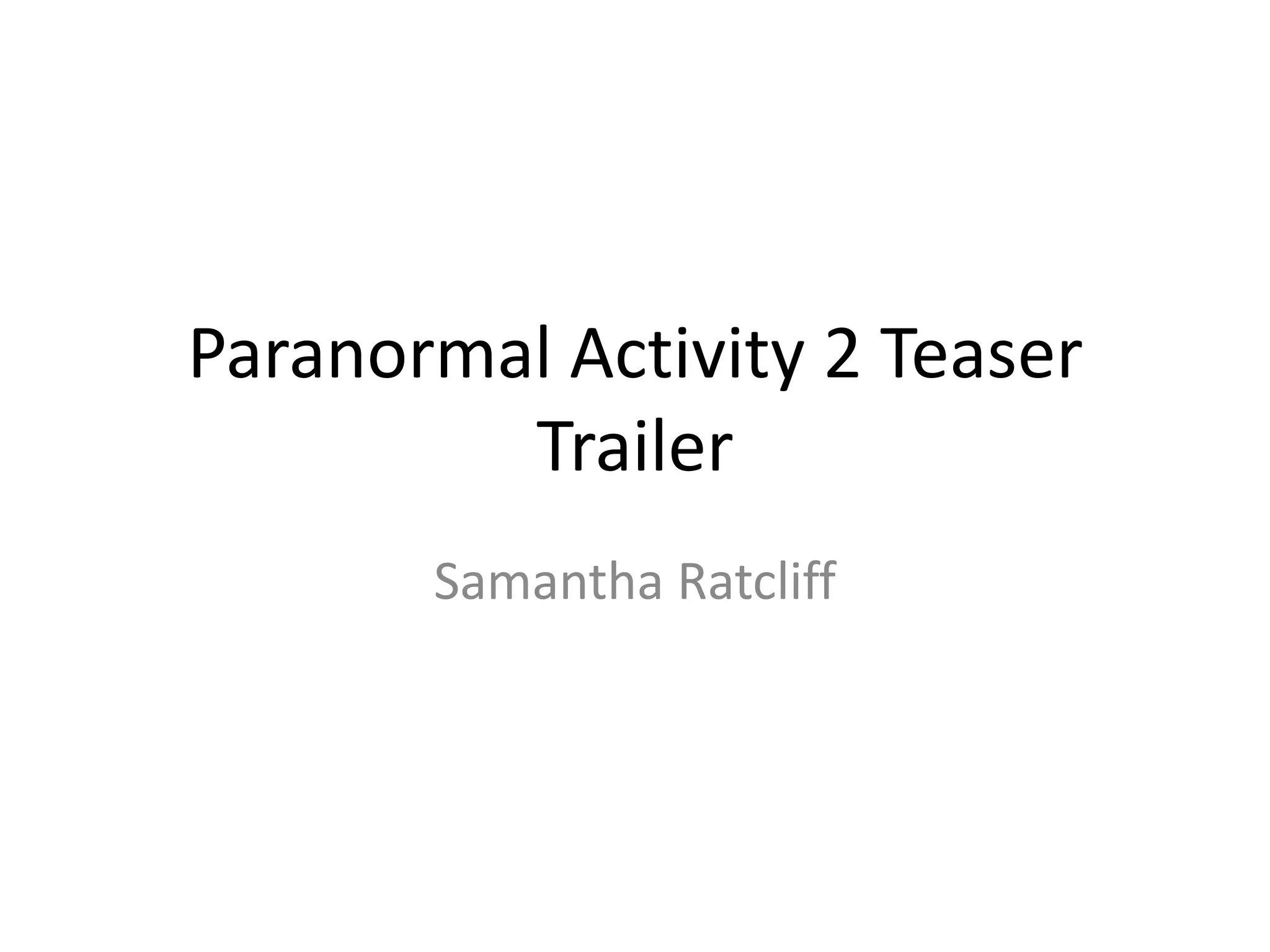 This document provides an analysis and summary of the teaser trailer for Paranormal Activity 2. The trailer uses techniques like blackouts, loud bangs and realistic documentary-style filming to startle audiences and build tension. It also includes clips from the first film to remind existing fans and intrigue new viewers. Dark colors and low tones throughout maintain an unsettling atmosphere. Shots of a house and its empty rooms hint at the film's storyline while leaving audiences wanting more information. The trailer effectively engages audiences through its unnerving style and suspenseful glimpses at the plot.