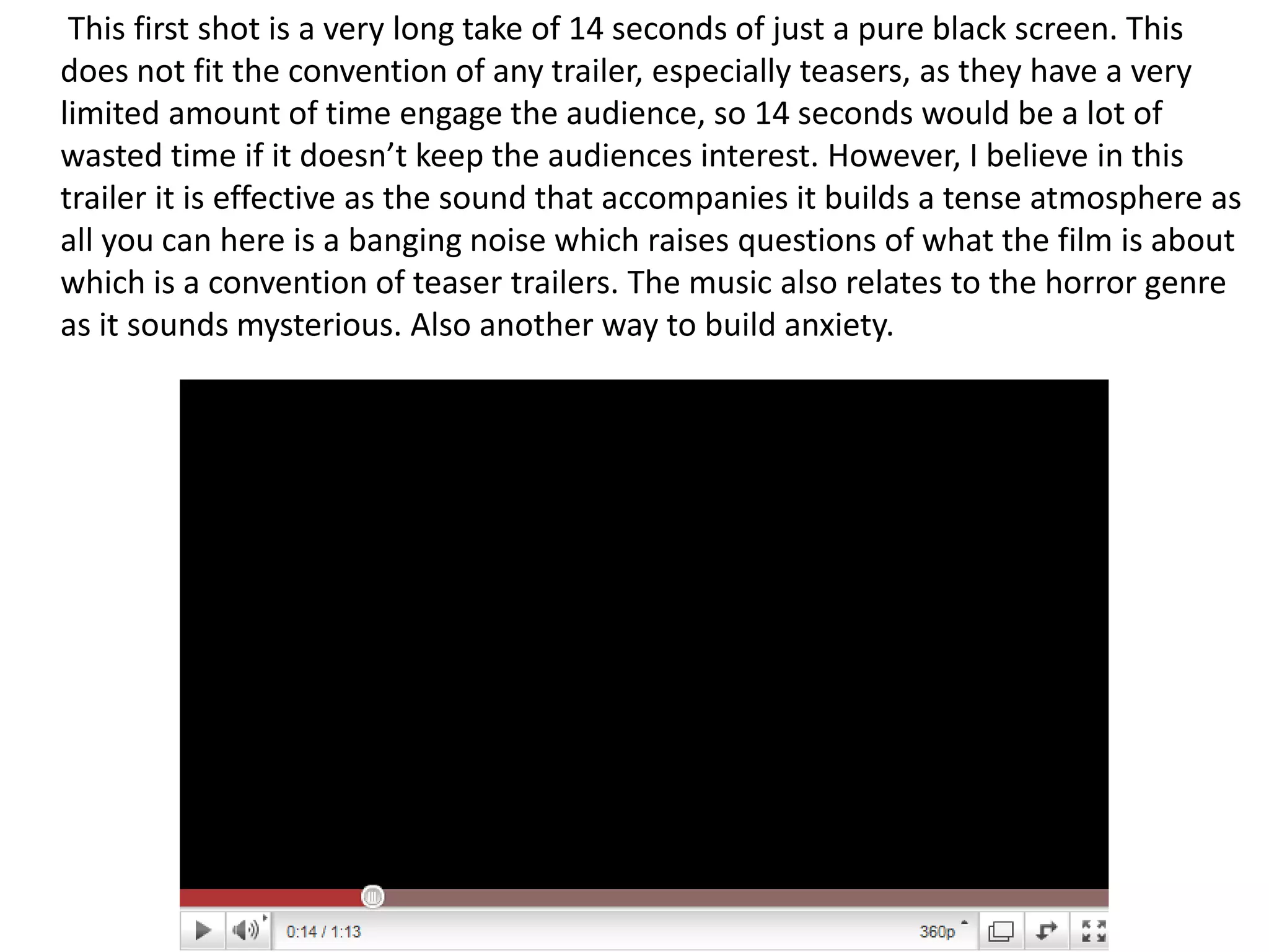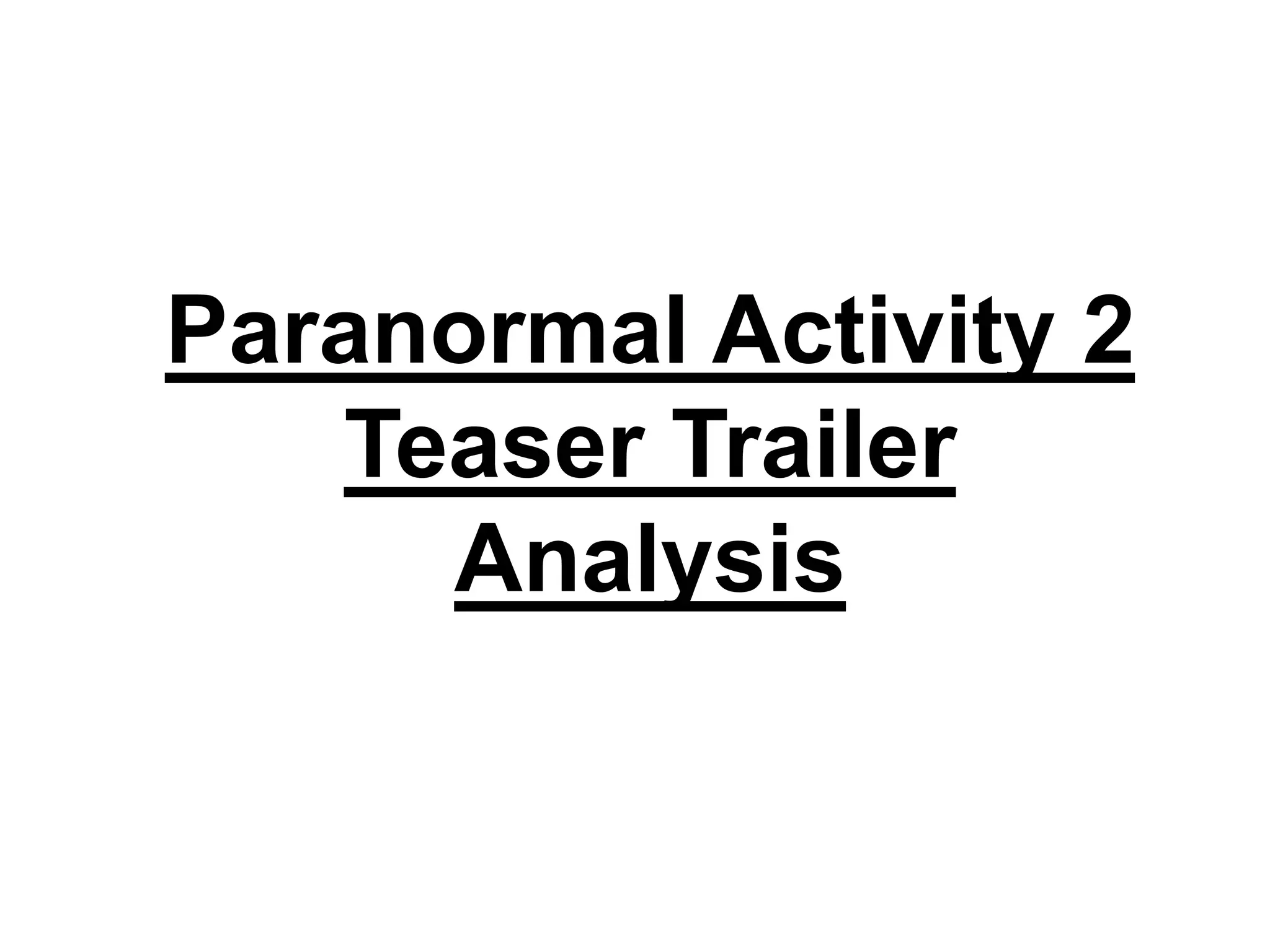 This teaser trailer for Paranormal Activity 2 uses unconventional techniques to build tension and mystery. It begins with a long black screen with ominous music to unsettle viewers. Reaction shots of a terrified audience watching the film are included to show how frightening it is. Scenes around a house at night show a child and dog, with subtle changes between shots raising questions. When viewers return to the child's bedroom, he has vanished, leaving them wanting answers that the full film will provide.