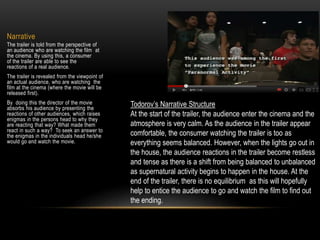 The trailer for Paranormal Activity uses found footage style camerawork and focuses on building mystery and tension. It shows footage of a cinema audience reacting in fear to something happening on screen but does not reveal what they are seeing. This is meant to intrigue viewers and make them want to find out the source of the audience's fear by watching the film themselves. The trailer also uses darkness, diegetic sounds like screams, and unexplained visuals to create an unsettling atmosphere and enigma around the plot of the film.