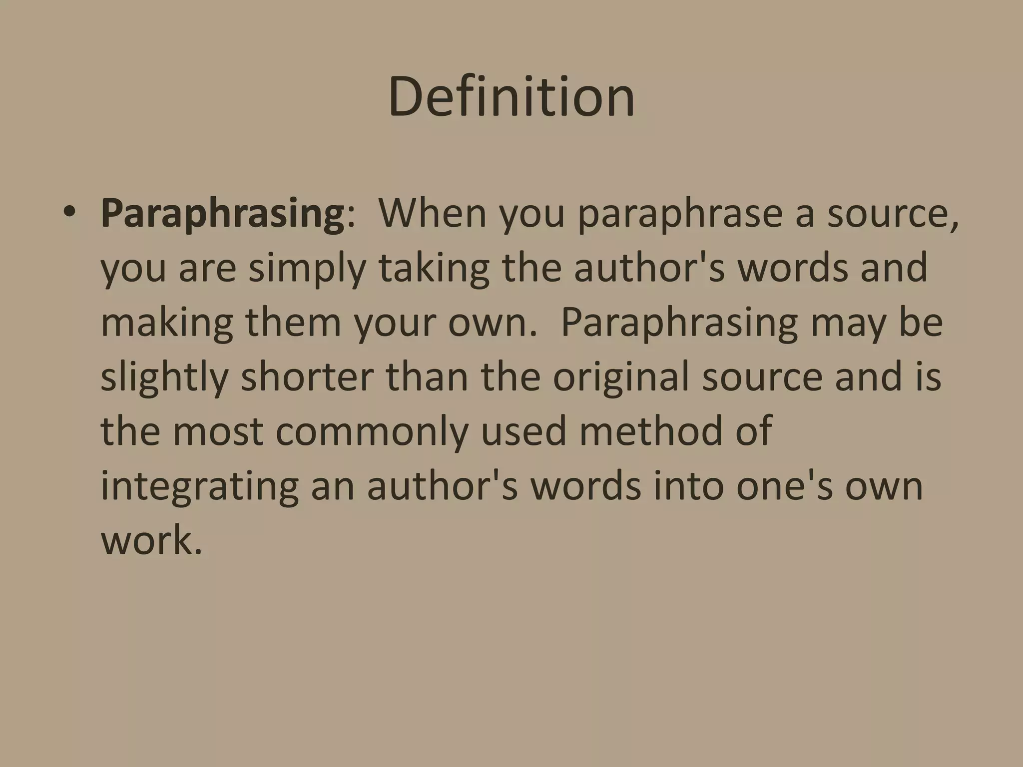 This document defines paraphrasing and provides guidance on how to properly paraphrase sources. It states that paraphrasing involves taking an author's words and making them your own while maintaining the overall meaning. Paraphrasing should be slightly shorter than the original and change the wording and sentence structure significantly. The document outlines a five-step process for paraphrase and discusses common mistakes like not altering the wording or ideas enough that can result in plagiarism. It also provides two sample paraphrases, identifying one as plagiarized for not changing the structure or words, while the other is not plagiarized because it properly cites the source and rewords the original passage.