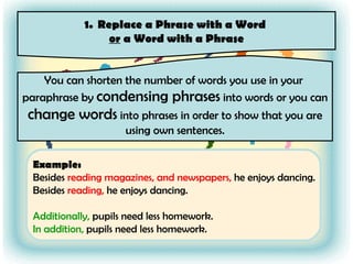 Paraphrasing a document involves condensing it while maintaining the key ideas. This can be done in several ways, such as shortening phrases, rearranging clauses, replacing words with synonyms, or changing between active and passive voice. Proper paraphrasing demonstrates understanding of the source material through use of the writer's own sentences and variety in structure.