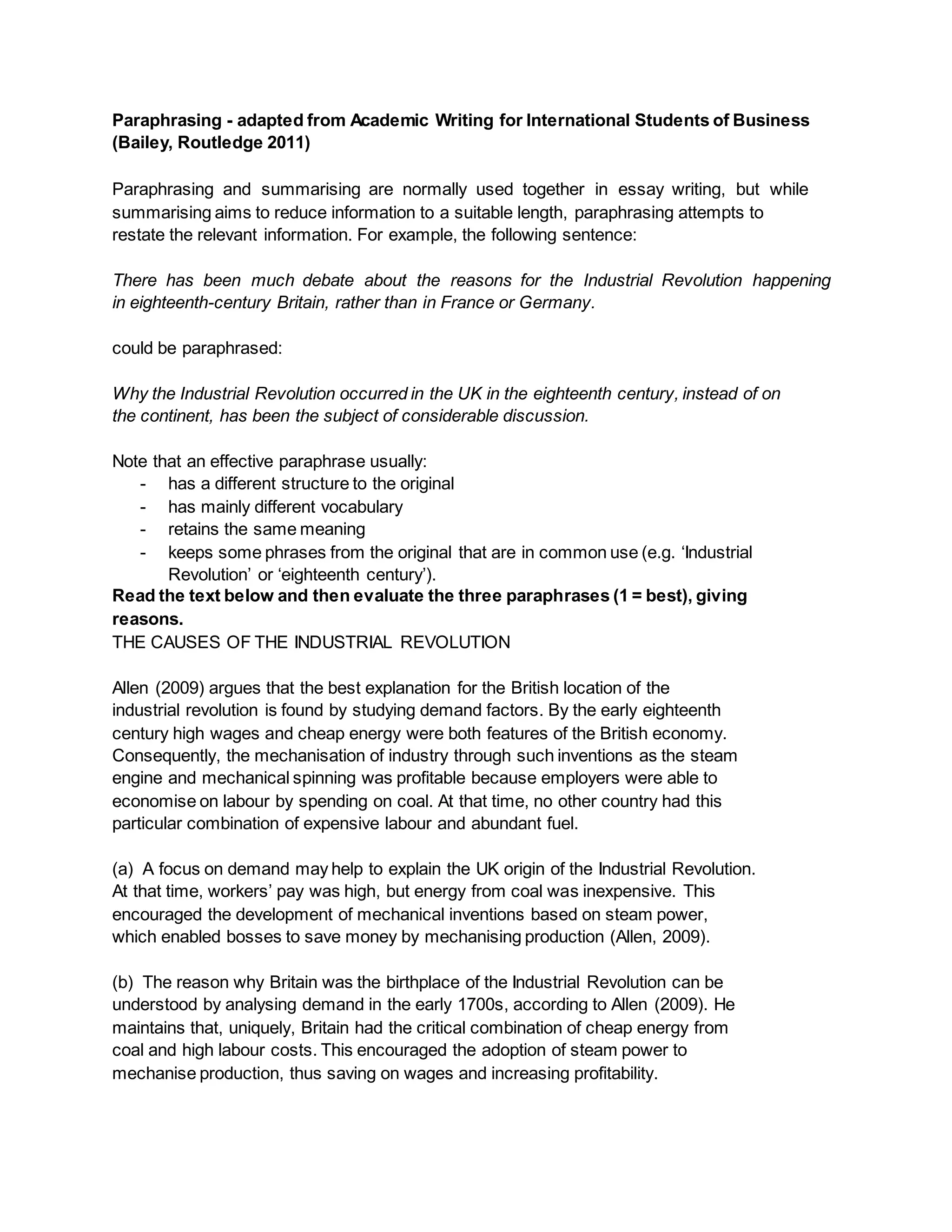 The document discusses paraphrasing and summarizing text. It explains that paraphrasing attempts to restate information in a new structure using different vocabulary, while maintaining the original meaning. The document provides an example of paraphrasing a sentence about the Industrial Revolution. It also lists techniques for effective paraphrasing, such as changing word order and word class.
