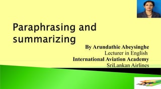 The document discusses the importance of paraphrasing and summarizing in academic writing to avoid plagiarism and to enhance understanding. It outlines techniques for effective paraphrasing and summarizing, such as using one's own language, identifying key points, and ensuring that the rephrased content is not shorter than the original for paraphrasing. Additionally, it emphasizes that summaries should condense material significantly, providing only the main ideas.