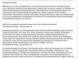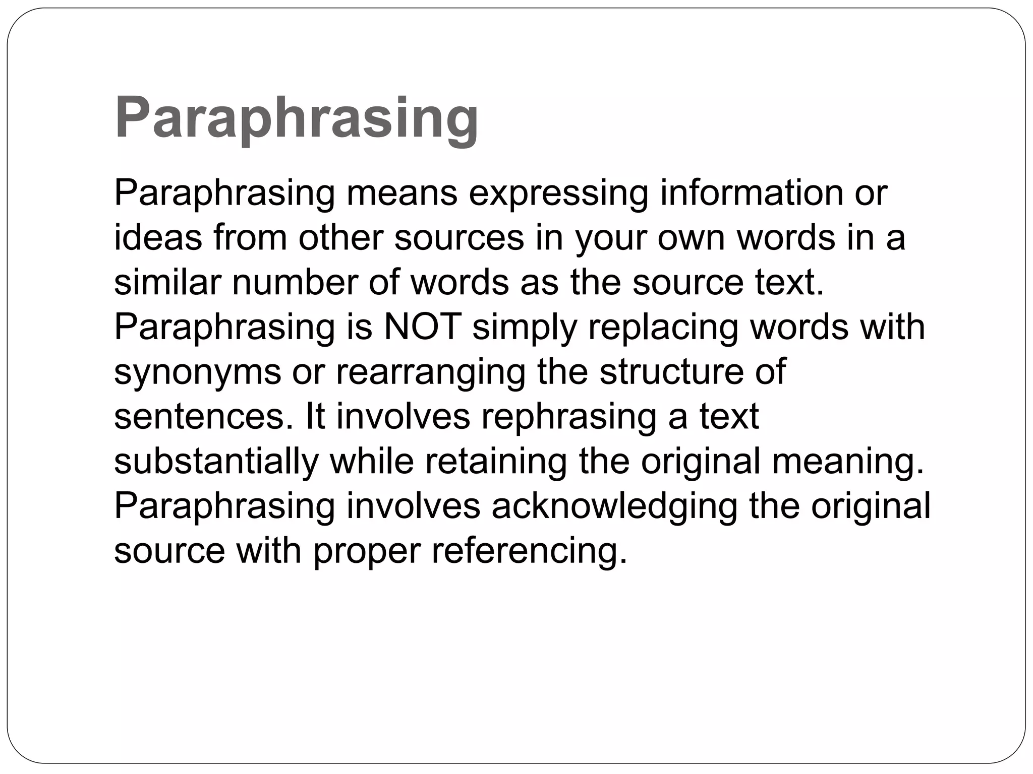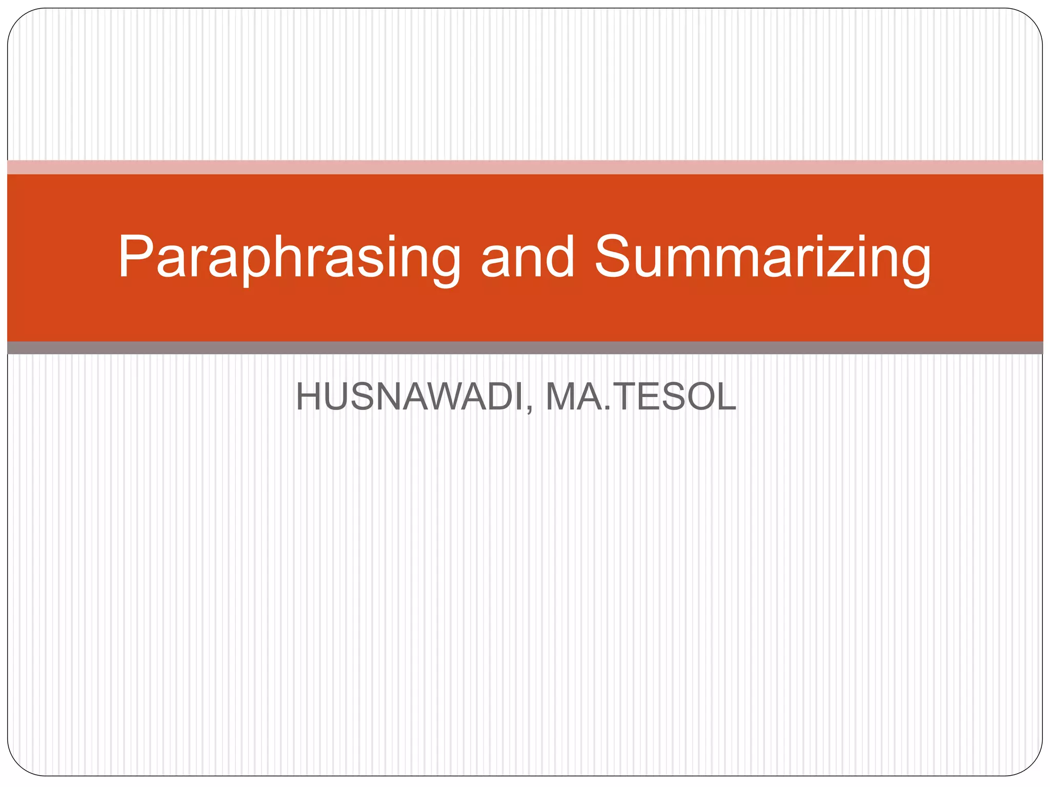 The document discusses paraphrasing and summarizing texts. It defines paraphrasing as rephrasing the ideas from another source using similar number of words while retaining the original meaning. Summarizing is expressing another writer's key ideas in fewer words. The document provides tips for paraphrasing, including using synonyms, changing verbs and grammar, combining sentences, and moving phrases to change the structure. It emphasizes paraphrasing involves acknowledging the original source.