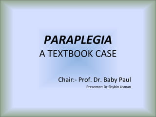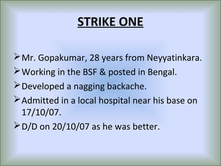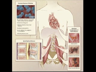 This document describes a case of spinal epidural abscess in a 28-year-old man. He developed back pain that progressed to weakness and loss of sensation in his lower limbs. Imaging showed an epidural abscess involving several vertebrae. He underwent surgery to drain the abscess and was treated with antibiotics. Histopathology confirmed tuberculosis. He showed improvement in strength after treatment but was discharged with some residual weakness. The document also provides an overview of spinal epidural abscess, including causes, clinical features, diagnosis, treatment and prognosis.