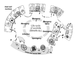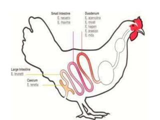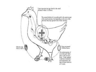 Coccidiosis, disebabkan oleh Eimeria, dan leucocytozoonosis, oleh Leucocytozoon, adalah penyakit parasiter pada ayam yang dapat menyebabkan kematian tinggi dan penurunan produksi. Helminthiasis, yang meliputi berbagai jenis cacing, juga berdampak ekonomi yang signifikan melalui hambatan pertumbuhan dan penurunan produksi telur. Pencegahan melibatkan sanitasi kandang dan pengendalian lingkungan untuk mengurangi risiko penyakit ini.
