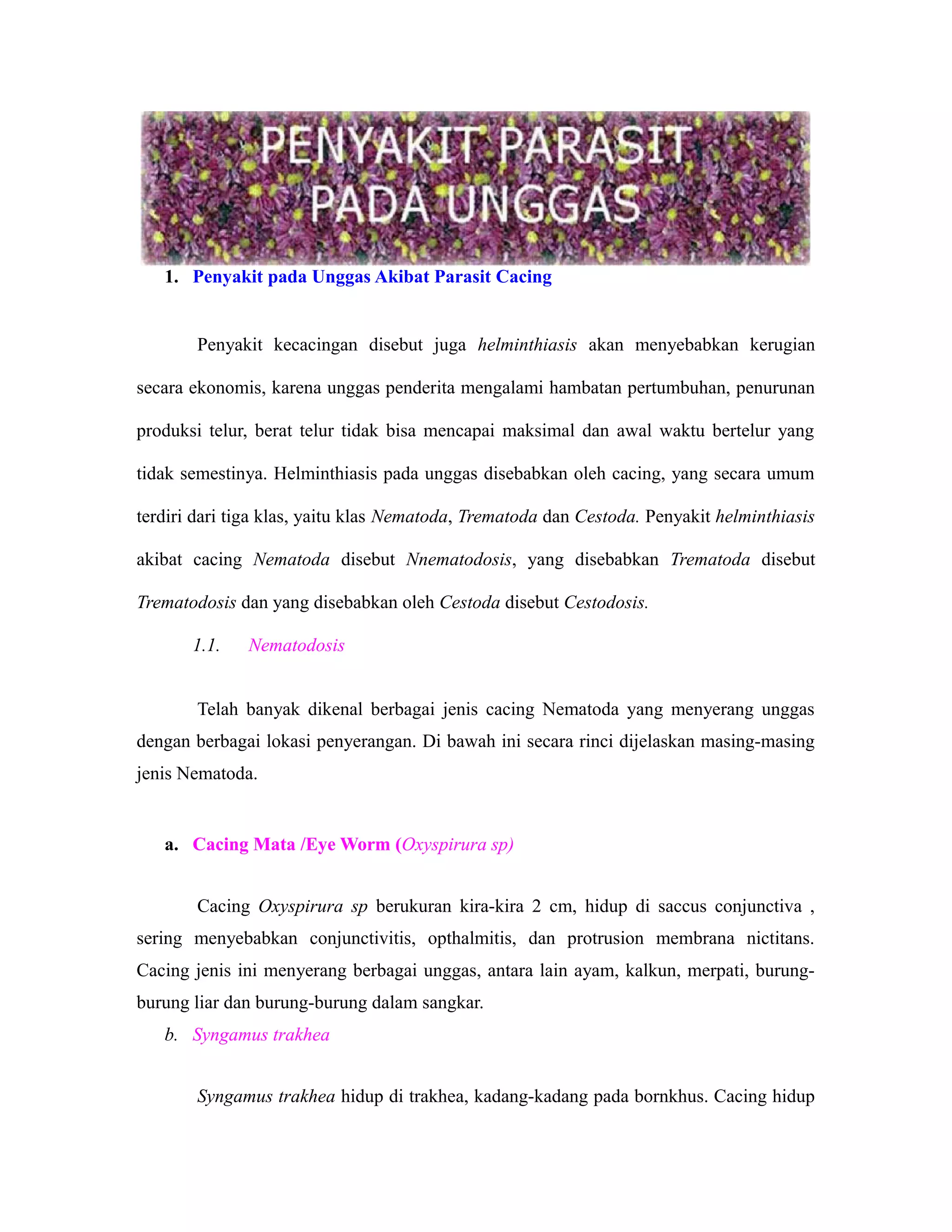 Parasit cacing menyebabkan berbagai penyakit pada unggas yang dapat mengakibatkan kerugian ekonomi. Terdapat tiga kelas utama parasit cacing yaitu nematoda, trematoda, dan cestoda yang menyerang berbagai organ tubuh unggas seperti mata, trakea, usus, dan sekum. Siklus hidup kebanyakan parasit cacing melibatkan inang antara sebelum menginfeksi unggas definitif.