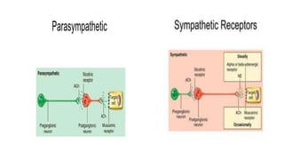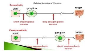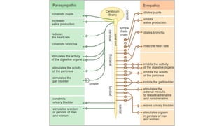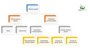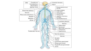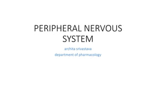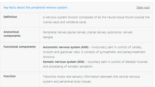 The peripheral nervous system (PNS) consists of nerves branching from the brain and spinal cord that allow electrical impulses to travel between the central nervous system and the rest of the body. It is divided into the somatic nervous system and autonomic nervous system. The somatic nervous system controls voluntary activities through spinal and cranial nerves. The autonomic nervous system regulates involuntary functions through the sympathetic and parasympathetic divisions.
