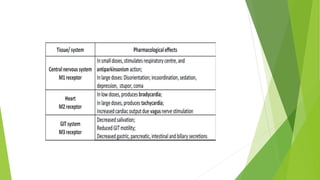 Parasympatholytics are drugs that block acetylcholine at postganglionic nerve endings and cholinergic receptors. They include natural alkaloids like atropine and hyoscine, as well as semisynthetic and synthetic compounds. Atropine is a prototypical parasympatholytic that acts as a competitive muscarinic receptor antagonist. It has therapeutic uses as an antispasmodic, antisecretory agent, and in ophthalmology for mydriasis and cycloplegia. Adverse effects include dry mouth, blurred vision, urinary retention, and hyperthermia. Overdose of atropine or related anticholinergic drugs can cause acute belladonna poisoning with