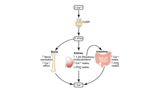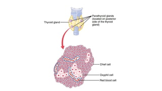 The document discusses the parathyroid gland's anatomy, function, and related pathophysiology. It explains that the major role of the parathyroid gland is to regulate calcium and phosphate levels, with its hormone, parathyroid hormone (PTH), affecting bone, kidney, and intestinal absorption. Conditions such as hypoparathyroidism and hyperparathyroidism are described, along with their impact on calcium levels and bone health.