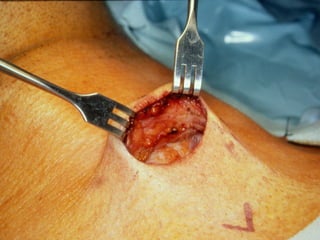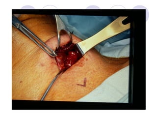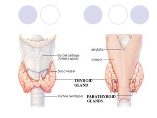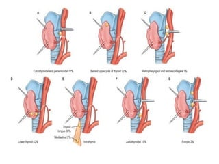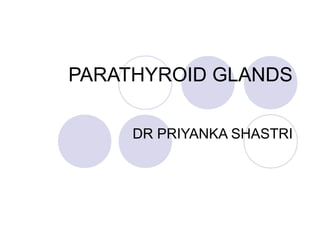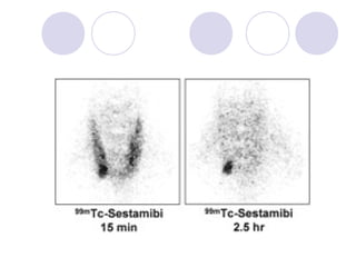 The parathyroid glands are small endocrine glands located on the thyroid gland that secrete parathyroid hormone (PTH) to regulate calcium levels. Primary hyperparathyroidism is usually caused by a solitary parathyroid adenoma. Pre-operative localization with sestamibi scanning is accurate for adenomas. Surgical treatment involves either unilateral or bilateral neck exploration to remove the abnormal gland(s), with minimally invasive radioguided parathyroidectomy being an option for localized disease.