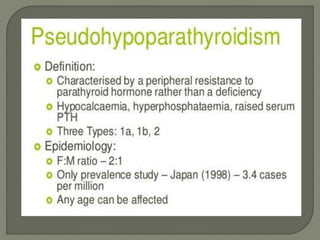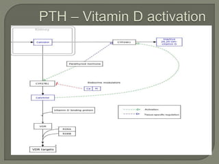 This document discusses the functions and regulation of parathyroid hormone (PTH), detailing its structure, secretion mechanisms, and implications in various disorders like primary hyperparathyroidism. PTH plays a crucial role in calcium homeostasis, stimulating bone resorption and affecting kidney function, while its secretion is primarily regulated by serum calcium levels through negative feedback. It also touches on the clinical manifestations of PTH-related conditions and treatment approaches, including the use of calcitonin.